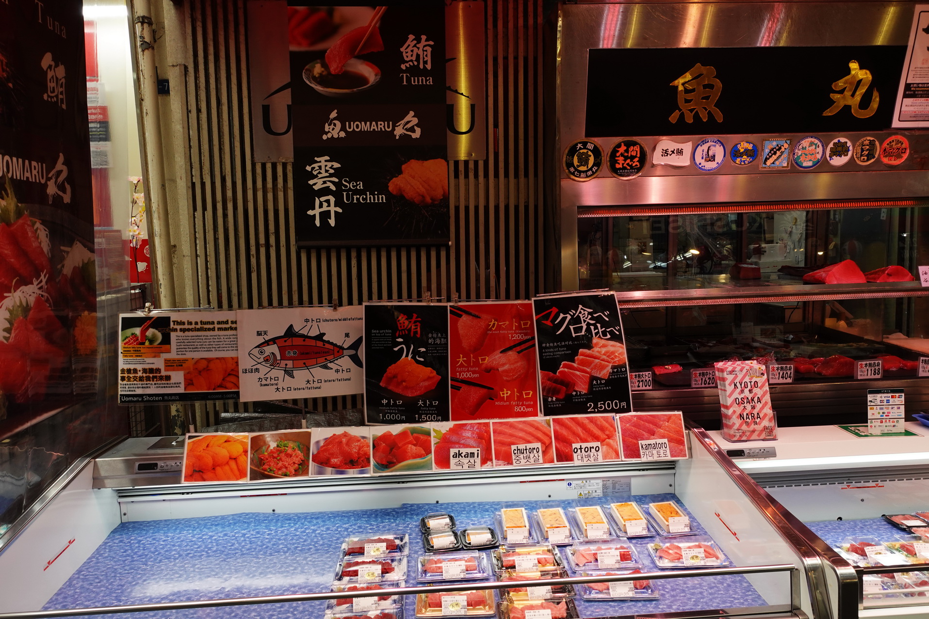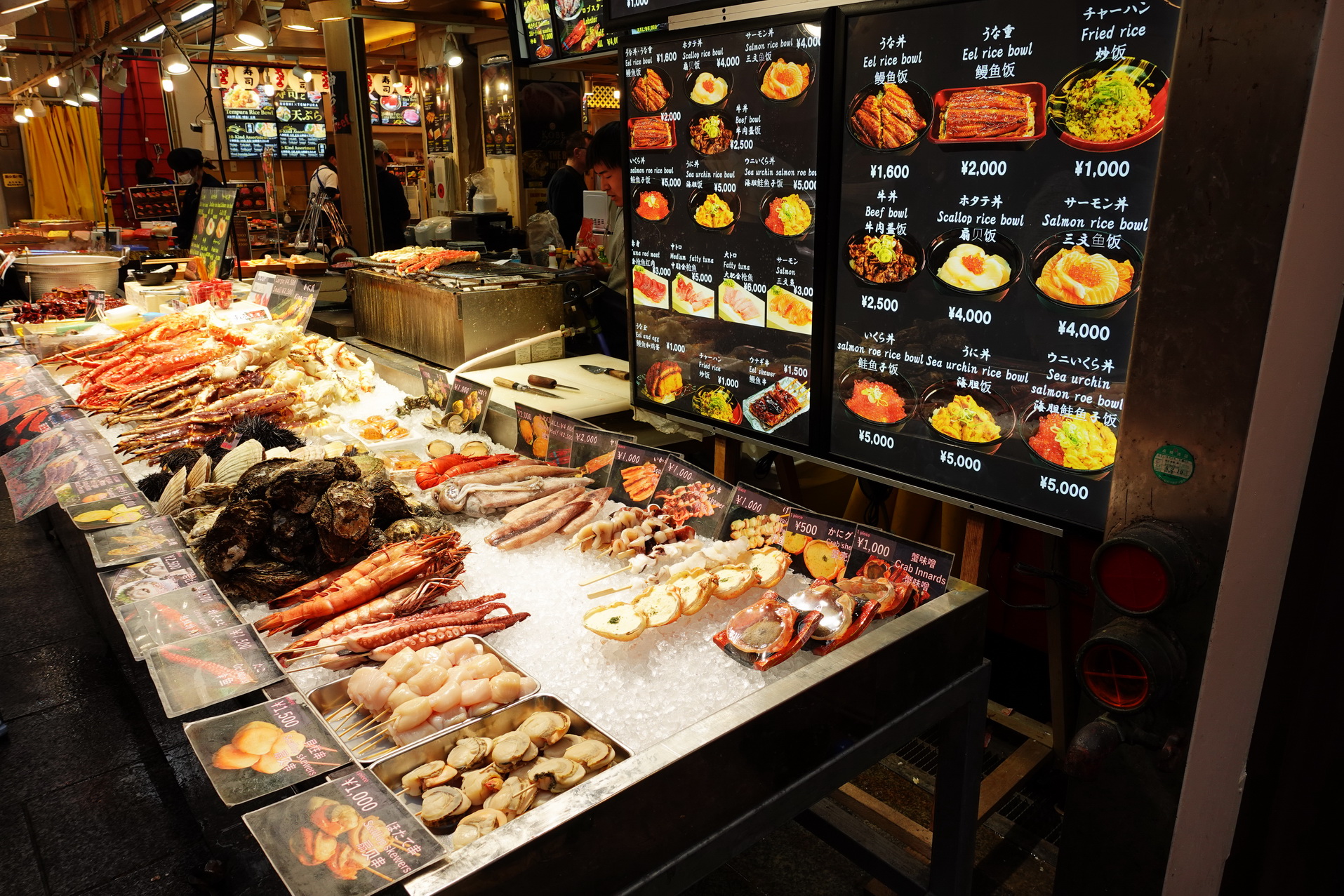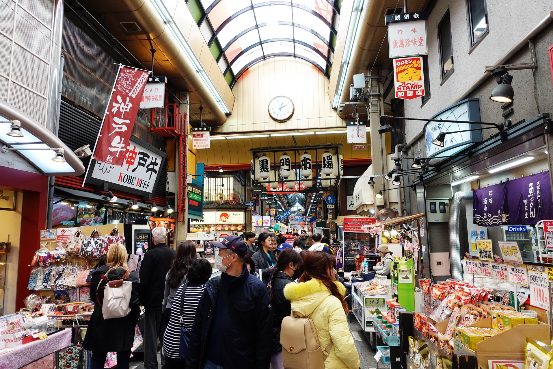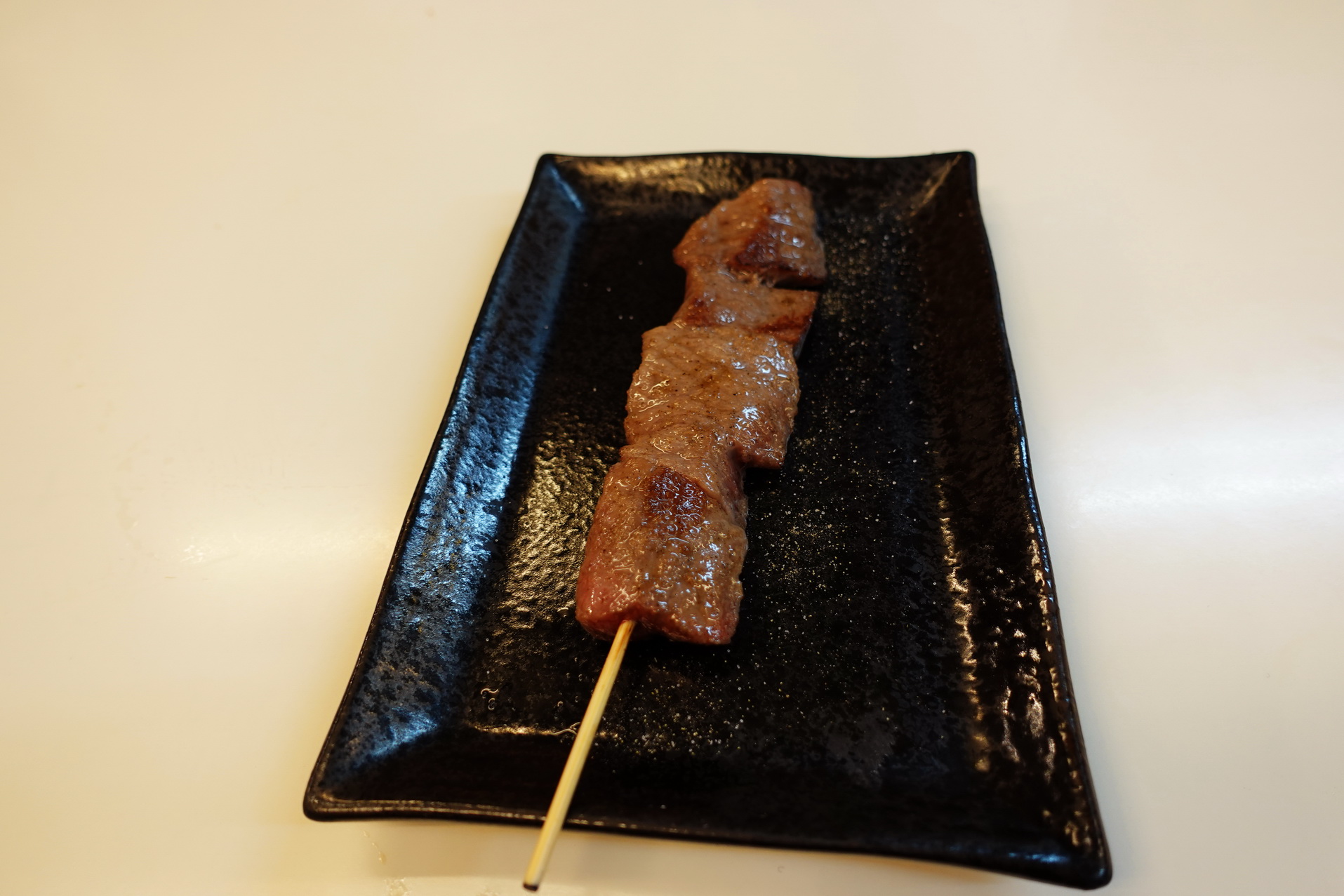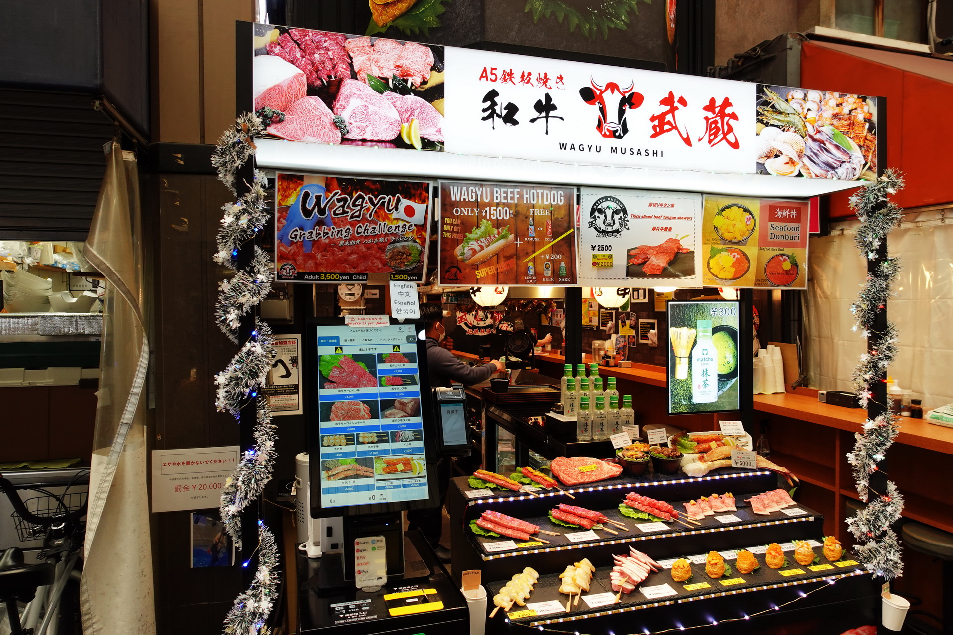På Kuromon Market testade jag kött från Kobe för första gången. Köpte ett litet spett som jag pekade ut och som grillades framför mig. 1500 Yen kostade det. Det var inte många gram. Gissar på max 50 gram. Det var dock inte äkta Kobe beef. Då hade det varit många, många gånger dyrare.