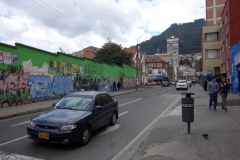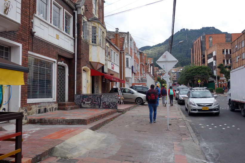 När jag kommit tillbaka till rummet lämnade jag telefonen och merparten av mina kontanter i safetyboxen. Jag vill inte tappa min telefon då den är så pass ny. Det är dessutom tredje telefonen jag köper på ett och halvt år så det börjar bli mycket pengar. Jag var nu redo för min första heldag i Colombia. Tanken var att den skulle spenderas i La Candelaria, Bogotás historiska stadsdel. När jag sedan skulle ge mig av frågade jag i receptionen om dom kunde beställa en taxi till La Candelaria åt mig. Det visade sig att en herr Carlos som jobbar i receptionen kunde köra mig. När jag kollade i min nyinstallerade taxi-app så skulle resan kosta 17 000 COP och Carlos ville ha 25 000 COP. Jag tyckte priset var sjyst med tanke på att han pratar så bra engelska. Det skulle visa sig vara ett bra val. Han tog en längre och vackrare väg med mindre trafik. Vi åkte Av. Circunvalar (Carrera 1) som går längs östra sidan av staden efter bergssidan genom flera av stadens riktigt fina och dyra bostadsområden. Jag fick se riktigt fina vyer på åkturen och vi stannade även på en fantastisk utsiktsplats (Av. Carrera 3 Este) så jag kunde ta lite bilder av denna gigantiska stad på närmare tio miljoner invånare. Innan vägen svängde ner mot La Candelaria passerade vi starten på leden upp till Monserrate. Ett hundratal meter bredvid ligger en linbanestation om man vill ta linbana upp till toppen. Då jag planerar ett besök till Monserrate någon annan dag så var det perfekt att få en liten inblick i hur området ser ut redan nu.