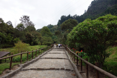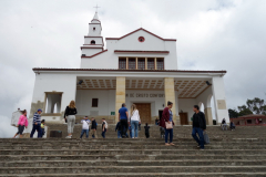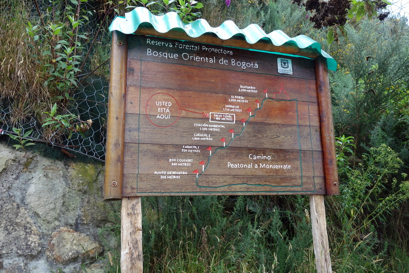 Efter frukost tog jag precis som igår en taxi till Taquilla Teleférico Monserrate. När jag kom fram var det en helt annan aktivitet än igår vilket gjorde mig glad. Det var öppet! Jag satte iväg direkt uppför leden och nu började vädret också bli lite bättre. Solen tittade fram här och där mellan molnen. En timme tog det mig att vandra i rätt snabbt tempo upp till kyrkan på toppen av berget på ungefär 3150 meters höjd. Vandringen började på dryga 2600 meters höjd. Det var riktigt jobbigt på några ställen som var lite brantare, men leden består av trappsteg nästan hela vägen och är väldigt enkel att vandra. På en flackare sträcka nära toppen fick jag eskort av en polis som inte tyckte att jag skulle vandra där ensam. Den här leden är notorisk för överfall och rån, även om det har minskat drastiskt på senare år framförallt på grund av högre polisnärvaro. Polismannen kunde bara spanska. Hade jag kunnat spanska hade jag nog fått höra en och annan historia om saker som skett på berget.