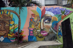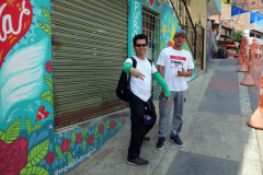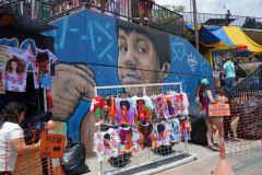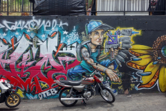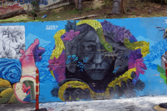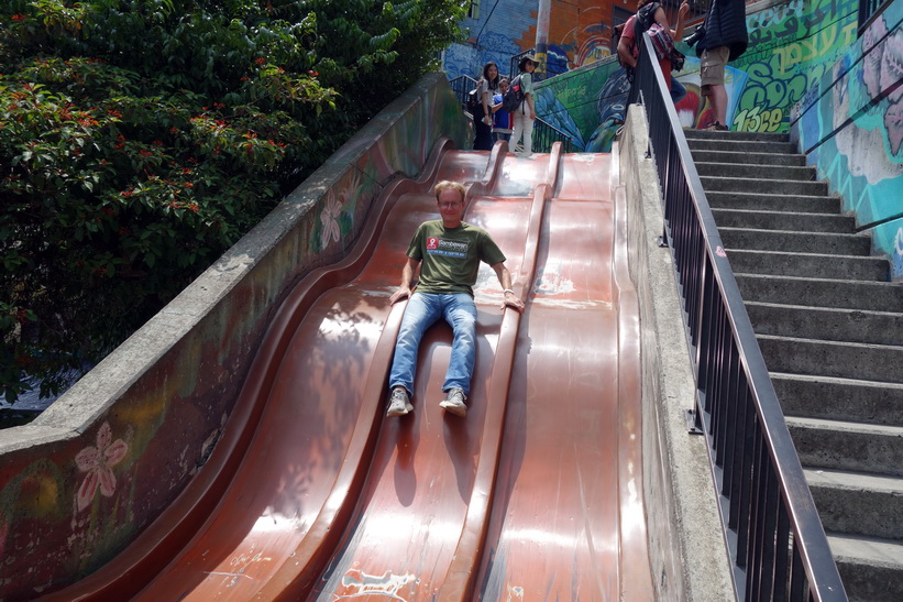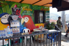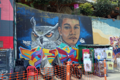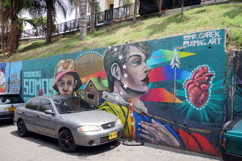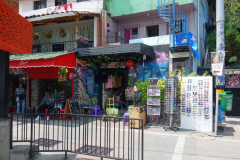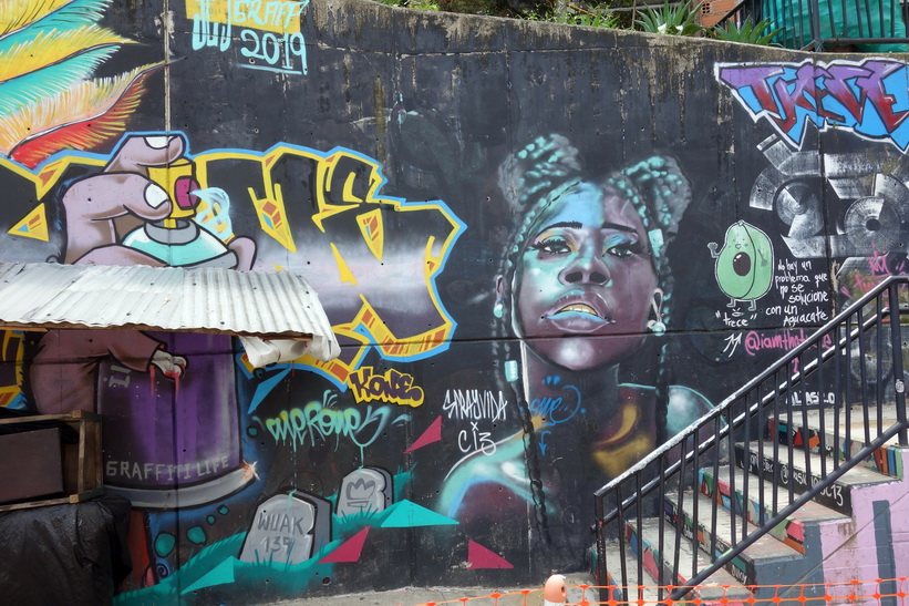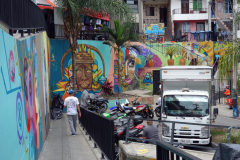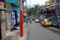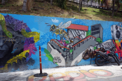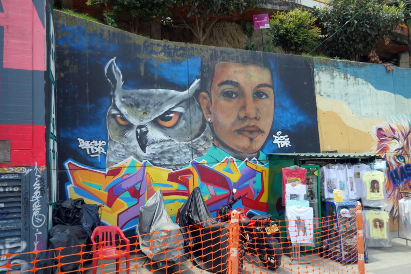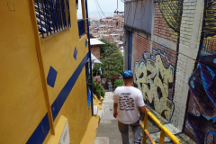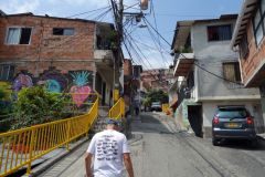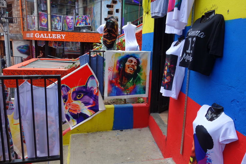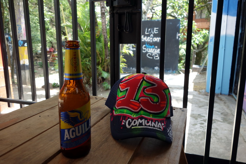 Tillbaka till min halvdagstur till Comuna 13. Jag hittade (som jag beskrev ovan) ett företag som jag tyckte verkade ha övervägande bra recensioner på nätet först och främst. Inte nog med det, denna turen utgår från Poblado vid station Poblado. Nära mitt hotell alltså. Jag chansade och dök upp hos Cívica Tours vid 9-tiden utan att ha förbokat någonting. Tre trevliga killar var på plats och verkade vara jätteglad att se mig. Jag fick genast ett bra första intryck av hela gänget. På företagets webbsida står det att turen ska börja klockan 10, men det visade sig vara inaktuell information. Klockan 9 och 14 kör dom varje dag. Det passade mig perfekt. Efter att ha betalat 50 000 COP gick allt mycket snabbt. Jag och en av killarna som heter Mario gick direkt iväg till metron och station Poblado några meter bort. Mario pratar flytande engelska och skall senare visa sig agera översättare till den lokala guide som bara pratar spanska. Jag var redan på väg mycket tidigare än väntat till denna intressanta stadsdel! Först tog vi metron från station Poblado till station San Antonio där vi bytte till stadens andra metrolinje, linje B. Vi åkte till slutstation San Javier där vi mötte upp en lokal guide vid namn David Ricardo (känd under smeknamnet Flako i ”hooden”). Mario ringde upp honom när vi åkte metro och han svarade ja till uppdraget att guida mig idag. Flako kändes lite som en gangstertyp vid första intrycket. En numera mycket trevlig sådan skall tilläggas. Han pratade bara spanska så Mario översatte mellan oss medan vi vandrade genom Comuna 13. Jag fick en bra förklaring av det mesta rörande stadsdelens historia samt även svar på alla frågor jag hade. Flako verkade känna var och varannan person vi mötte vilket gav en väldigt trevlig känsla. Han verkade vara en kändis överallt. Jag tyckte att jag ville ha en souvenir med mig från den här dagen. Det blev till slut en keps som har ett handmålat motiv på sig samt en Comuna 13 ölflaska. Paret som ägde keps-affären var kompis med Flako, vilket gjorde det ännu enklare att köpa kepsen av just dom.