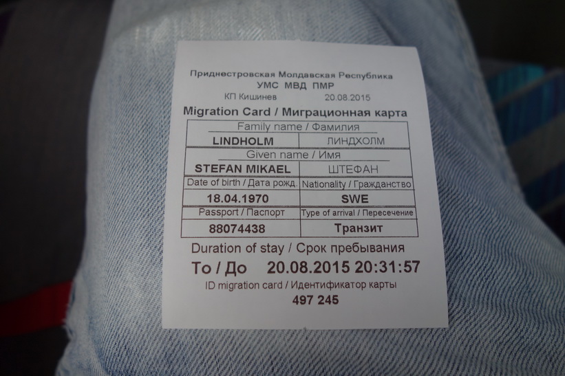Mitt immigrationskort som jag fick när jag åkte in i Transnistrien. Jag fick detta kort precis klockan 10.31 vilket blir resultatet om drar bort tio timmar från 20.31. Detta kort var jag mycket rädd om under vistelsen!