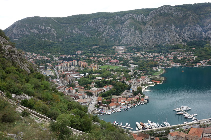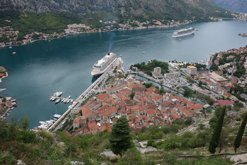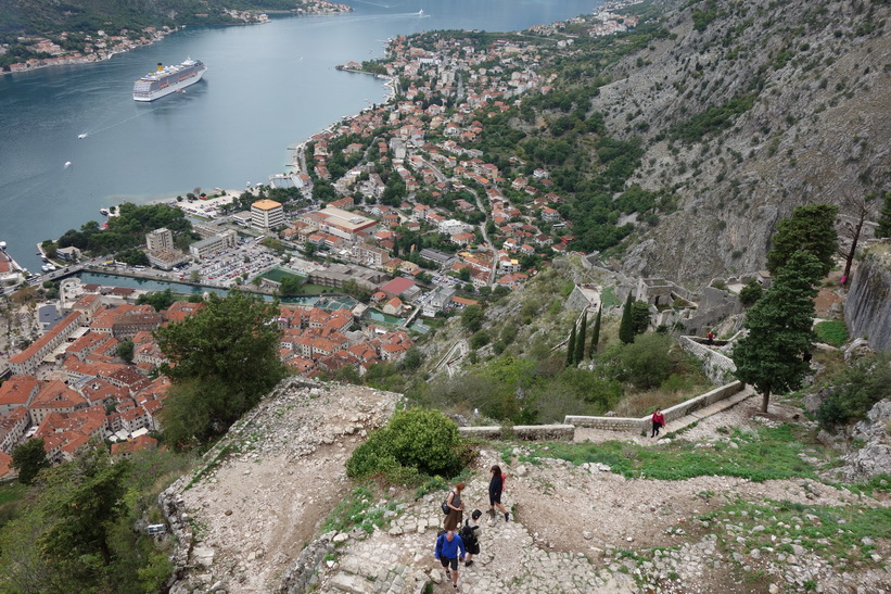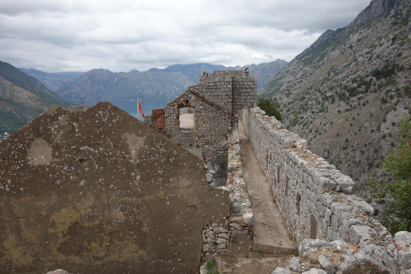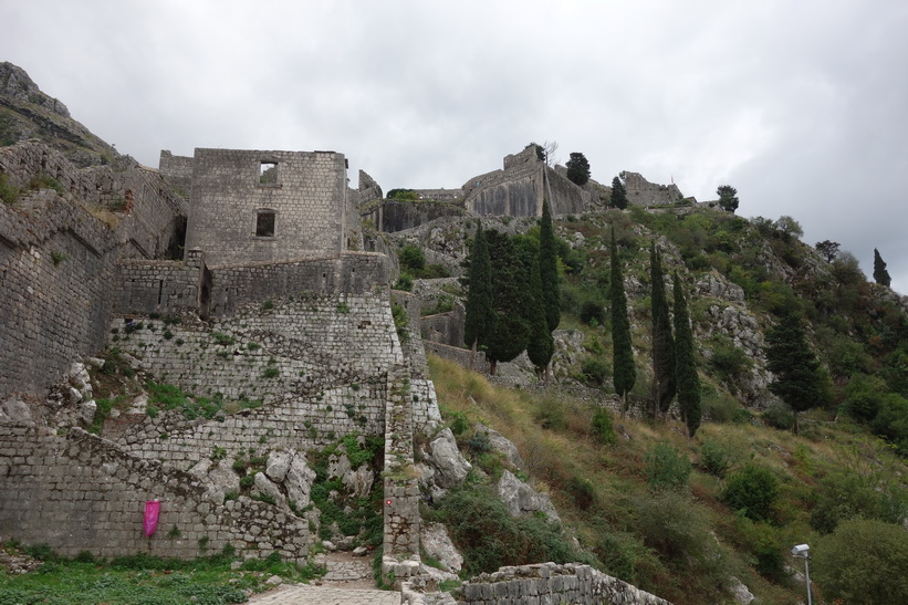 Tack vare att vädret blev hyfsat idag kunde jag göra allt jag hade tänkt här i Kotor. Först en rejäl runda i gamla staden och sedan klättring upp på berget längs ringmuren som går nästan ända upp till toppen av berget bakom gamla staden. Naturen och staden är bedårande vackra. Gamla staden i Kotor är nog den mysigaste jag någonsin besökt. Klättringen upp längs ringmuren gjorde att jag var genomsvettig när jag nådde toppen. Runt 260 meter över havet har jag läst att toppen av ringmuren ligger på. Ringmuren byggdes under medeltiden för att skydda Kotor från invasion. Man blir imponerad när man inser vilken arbete det måste att ha varit att bygga allt detta upp längs bergväggen. Går man i lagom fart så tar det ca två timmar att gå upp och ner. Minst en liter vatten är bra att ha att ha med sig, särskilt om det är sommarhetta.