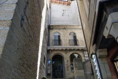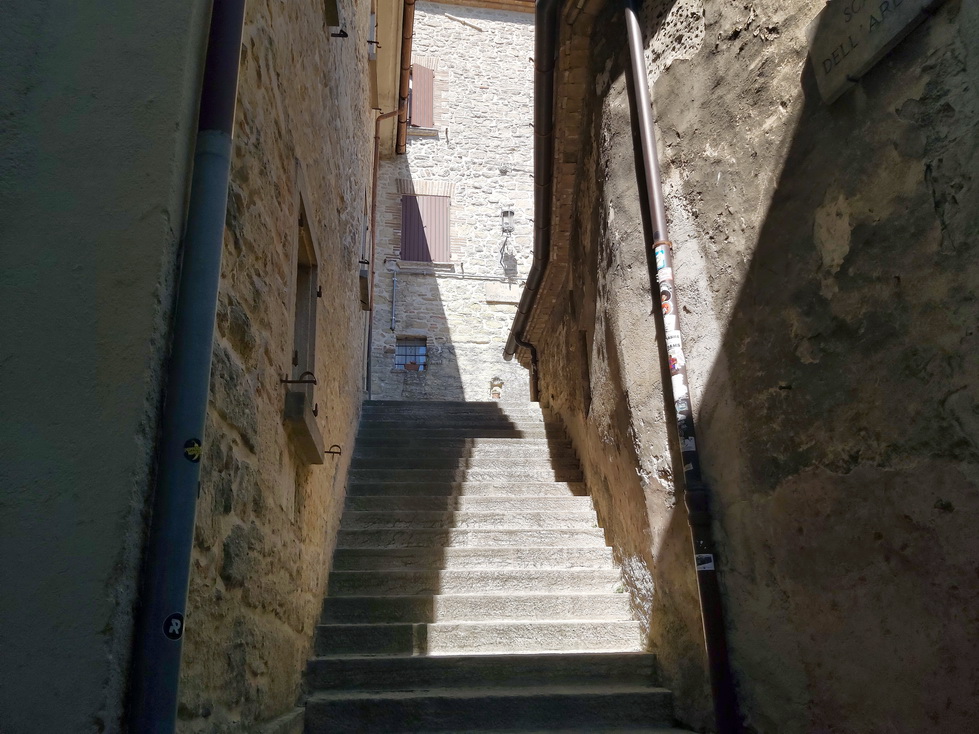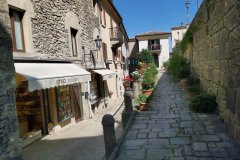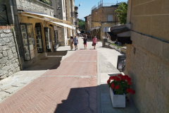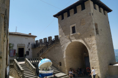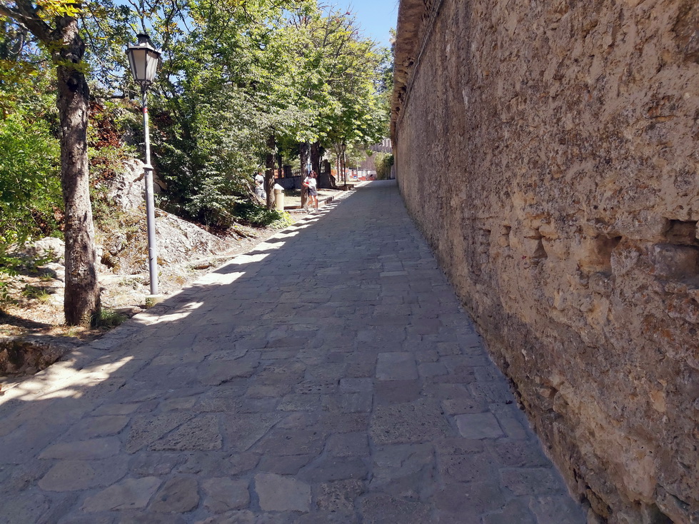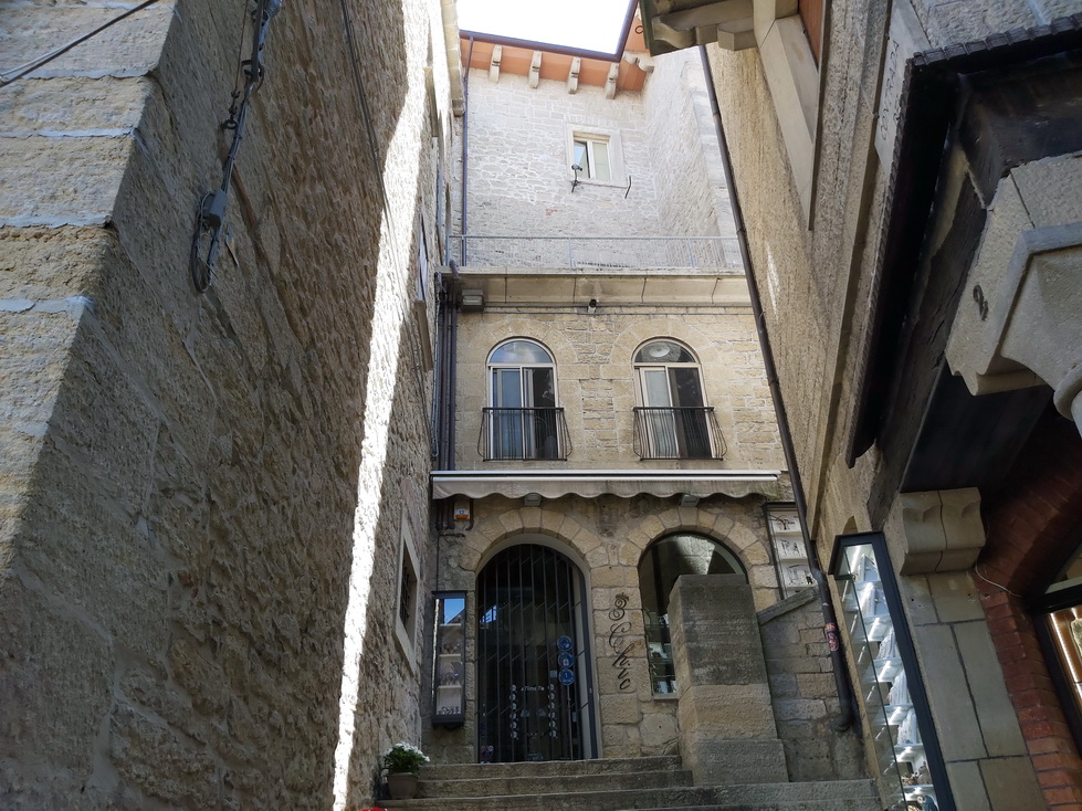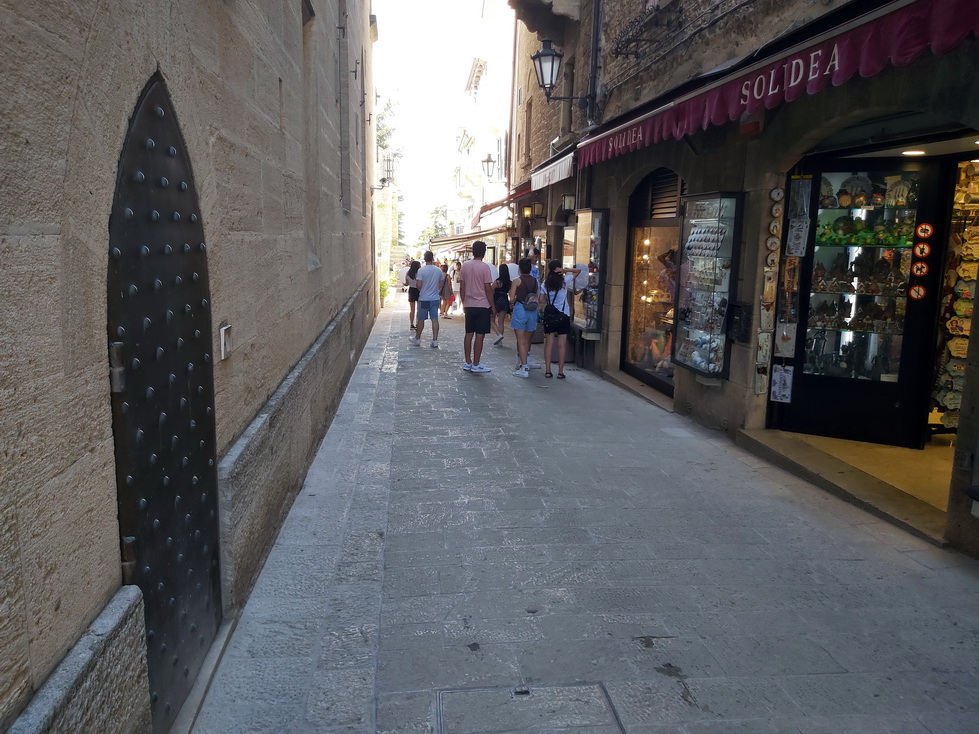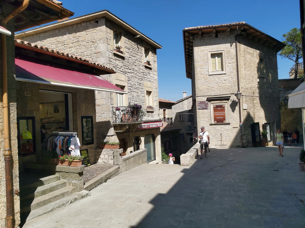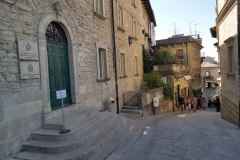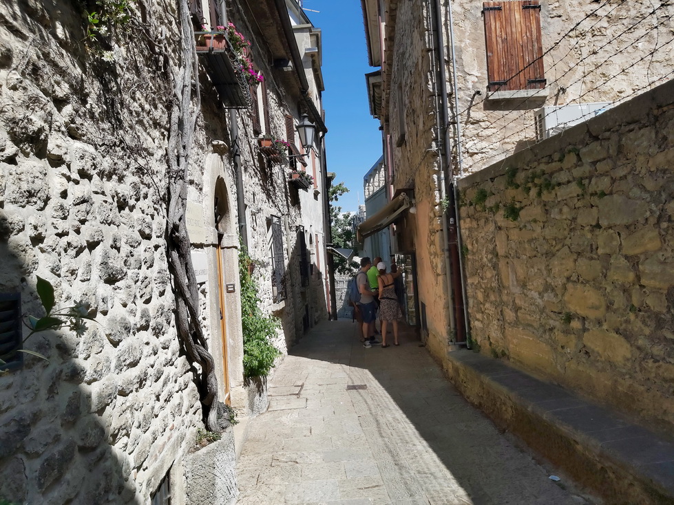Sista biten av resan till huvudstaden San Marino börjar det luta brant uppför och det blir vackrare och vackrare för varje meter. När bussen kommit fram till slutdestinationen, huvudstaden San Marino, hoppar jag av bussen och börjar kolla på google maps för att se om jag kan lokalisera hotellet jag bokat. Jag hade bokmärkt hotellet innan jag åkte precis som jag brukar. Jag hittar rätt snabbt markeringen på kartan och börjar gå i den riktningen. Jag vet inte vad som hände sedan, men jag lyckades gå två fulla cirklar så att jag två gånger kommer tillbaka till samma utgångspunkt! Jag som alltid brukar ha lätt för att navigera i stadsmiljö var nu helt förvirrad. Samtidigt som jag känner en hopplöshet inför vilket håll jag nu ska gå börjar bli pissnödig också. Det är lite typiskt för situationen. Det slutar med att jag går in på en liten väg som är avspärrad med en liten lina och gör mina behov en bit in. Ett problem var nu ur världen! När jag börjar studera google maps igen ser jag ett helt annat spår till hotellet och jag känner inte igen rutten från hur det sett ut innan. Allt verkade mer logiskt nu. När jag gått något som kändes som början på cirkel eller varv tre ser jag att en del av muren som korsar serpentinvägen jag nu går på verkar finnas med i rutten. Där var felet jag gjorde tidigare! Jag tar mig upp på muren via en sidotrappa som leder upp till en gata med en massa affärer och en hel del turister. Det visar sig nu bara vara hundra meter kvar till hotellet. Men även när jag kommit fram alldeles vid entrén så har jag problem att se var ingången är. Det gör att jag börjar ifrågasätta kartan lite igen. Plötsligt ser jag skylten med namnet på hotellet ovanför en dörr. Tack och lov yrade jag inte omkring alltför länge, så efter incheckning och lunch på hotellet var klockan bara runt 13.30. Äntligen incheckad på hotellet i det sista landet jag hade kvar att besöka i Kontinentaleuropa! Bara Island kvarstår nu.