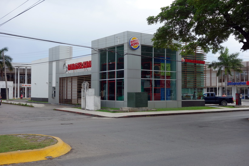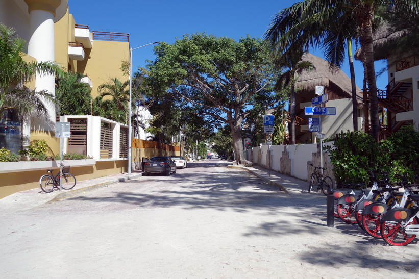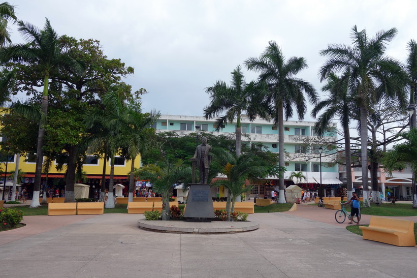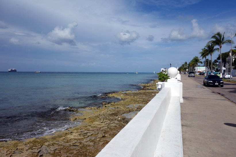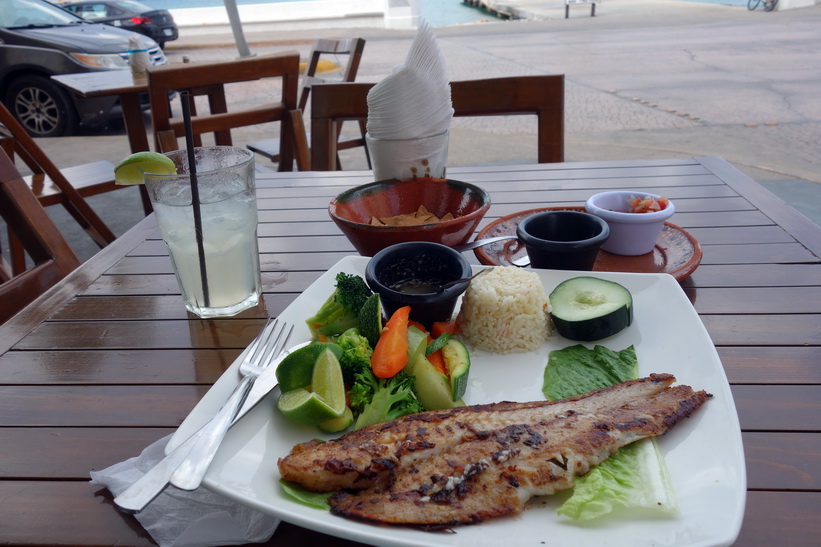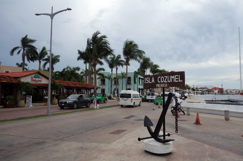 Jag och några få av de gissningsvis runt 200 passagerarna gick direkt upp och satte oss på taket på båten. Efter ungefär femton minuter in på resan kom det plötsligt ett stort regnmoln från ingenstans, något jag såg komma så jag snabbade mig in under tak för att ta skydd innan regnet kom. Flera andra blev kvar på taket, något som skulle visa vara förödande för några stycken. När regnet väl startade kom det samtidigt rätt starka vindar vilket gjorde att en tjej tappade sin mobiltelefon i havet och en annan tappade sitt pass! Regnet upphörde i stort sett precis när vi kom fram till öns huvudort San Miguel de Cozumel efter en resa på strax över en halvtimme. Jag gladde mig åt det då jag nu skulle gå och leta ett bra ställe att hyra en cykel. Jag hade sparat platsen för ett företag som hyr ut cyklar i google maps som jag tyckte det verkade vara bra i recensionerna. Trodde jag. Det fanns inget sparat när jag kollade min offlinekarta. Jag har inget lokalt SIM-kort, något jag inte tagit ställning till än om jag ska köpa. Jag har inte haft någon brådska med att ta det beslutet. Hur som helst så kunde jag alltså inte söka efter företaget i telefonen heller. Därför hade jag inte något annat val än att gå och leta cykeluthyrare och försöka fråga någon här och där. När klockan passerat tolv passade jag på att äta lunch, något som måste göras. Fortfarande ingen cykeluthyrare funnen. Däremot hittade jag en massa uthyrare av motorcyklar och bilar. Jag har inte med mig något körkort och heller inget internationellt körkort, vilket krävs här, så det går bort helt att hyra ett motorfordon. Bestämde mig strax innan resan att inte göra det. Dock så har jag hört många som rekommenderar att man hyr en bil åtminstone några dagar för att åka runt hela eller delar av Yucatán-halvön.