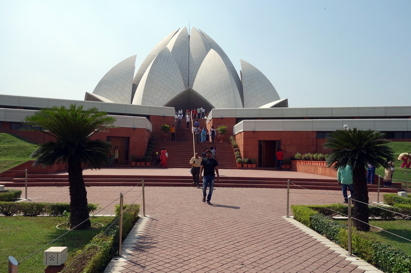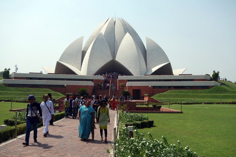 Metron tog mig via metrostation Kalkaji Mandir till Lotustemplet, den märkliga byggnaden som är byggd av vit marmor i form av en lotusblomma. Byggnaden uppfördes mellan 1980 och 1986. Snittet på antalet besökare till templet per dag är 12000 människor! Det som förvånade mig lite var att det var helt gratis entré även för turister. Man fick köa för att komma in i templet och väl inne så fick man sätta sig ner i bönesalen som påminner väldigt mycket om innandömet på en kyrka. Bahá’í är den religion som Lotustemplet representerar. Denna religion var en helt ny bekantskap för mig. Bahá’í är förutom en religion också en samhällslära innehållande en plan som många kanske skulle kalla utopi. Religionen grundades så sent som 1863. Alla Bahá’í-tempel har nio ingångar vilket är en symbol för att människor av alla religioner är välkomna att be sina böner eller läsa ur sina respektive heliga texter.