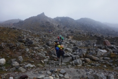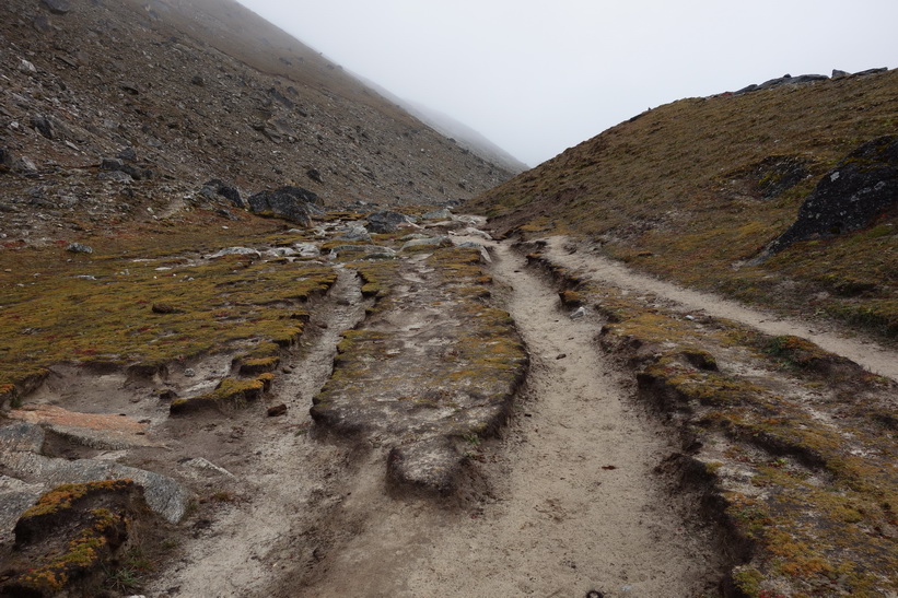 Månlandskapet som omgav oss på trekken upp till Gorak Shep kändes väldigt overkligt. Det mulna vädret gjorde troligen att allt blev lite mer mystiskt rent visuellt. Sträckan från Lobuche till Gorak Shep är inte så brant. Däremot så gör sig höjden riktigt ordentligt påmind längs denna sträcka i form av att varje liten brant känns otroligt jobbig. Det var rätt så mycket folk på väg både uppåt och nedåt. Både sherpas och turister. Mer trafik än tidigare dagar, men ändå relativt få människor. En anledning till det är att Lobuche är en knutpunkt för folk som vandrar både Everest Base Camp och Three Passes Trek. Precis som under vandringen i förrgår mellan Dingboche och Lobuche irriterade jag mig stundvis på att vädret var mulet.
