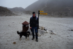 När jag kom fram till Gorak Shep hade jag dragit ifrån Peng ordentligt. Jag kände mig oförskämt pigg och fräsch och ville bara snabbt checka in någonstans och fortsätta vidare upp till Everest Base Camp. Jag hamnade på den lodge som ligger längst bort bland lodgerna, i riktning mot Everest Base Camp. Efter att ha rekat rummen lite checkade jag in. Jag passar på att beställa in te och vitlökssoppa. Efter att ha ätit upp gick jag ut för att se om jag kunde få syn på Peng i det dimmiga vädret. En liten stund senare ser jag hans gula jacka komma farande uppe på den lilla höjden ovanför byn, precis där leden viker av ned mot Gorak Shep. Jag viftar och ropar för att undvika att han checkar in på någon av de första lodgerna man stöter på när man kommer fram till Gorak Shep. Oftast blir det att valet faller på någon av de närmsta lodgerna när man är trött. I regel så är dom bästa lodgerna längre in i byarna. Att kalla Gorak Shep en by är dock kanske lite att ta i. Efter en stund får han syn på mig och kommer snabbt emot mig. Vi gratulerar varann över att ha nått så här långt och Peng verkar också vara väldigt pigg och fräsch. Han märker nog att jag är otroligt ivrig att komma iväg till Everest Base Camp eftersom hans incheckning på lodgen går väldigt snabbt. Vi ger oss båda iväg med endast mycket lätt packning. Det är obeskrivligt skönt att endast ha tre kilo packning på ryggen. På denna höjd behöver man verkligen inga extrakilon!