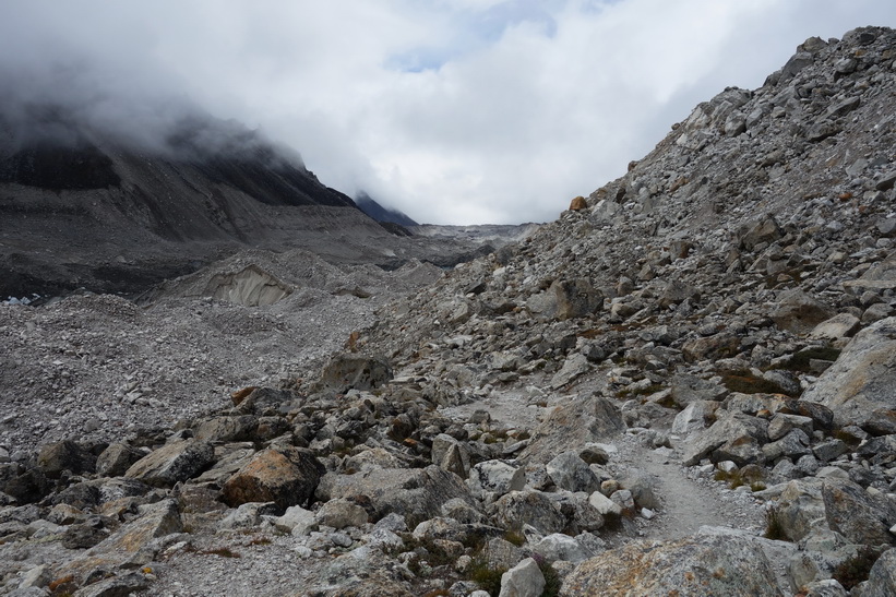 Vädret växlar från mulet till att se ut som att det håller på att klarna upp om vart annat längs trekken upp till Everest Base Camp. Det blir dock aldrig så bra att vi kan se bergen omkring oss vilket är tråkigt. Om landskapet var overkligt mellan Lobuche och Gorak Shep var det ingenting jämfört med att vandra längs denna översta del av Khumbu-glaciären. Jag har aldrig tidigare i mitt liv varit på dessa höjder så det är något också helt nytt för mig. Vi tar det säkra före det osäkra och går i ett väldigt långsamt tempo i början av vandringen. Efter en dryg timmes vandring börjar Khumbu-glaciären att ändra utseende och det dyker upp alltmer is. När jag precis börjar tro att inget liv kan leva här får jag syn på blommor längs leden!