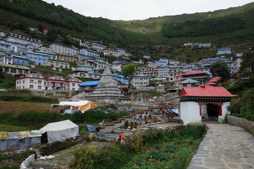 Strax innan man kommer fram till Namche Bazaar når man Mislung checkpoint där man måste presentera sitt TIMS-kort och kvittot som bevis på att man har betalat parkavgiften. Efter Mislung fortsätter leden uppför, om än inte lika brant som innan, den korta sista biten till Namche Bazaar. När jag kommer in i den nedre delen av Namche Bazaar, där marknadsområdet samt den stupa som skadades vid jordbävningen 2015 håller på att restaureras är beläget, ser jag två kända ansikten. Japanen och hans sherpa-guide! Dom hade startat riktigt tidigt från Monjo och anlänt till Namche Bazaar några minuter före mig. Dom var nu på väg till ett hotell dom hade förbokat. Dom tyckte att jag skulle följa med och kolla om det fanns rum till mig där också. Jag var riktigt slutkörd vid det här laget så det passade mig ypperligt att få lite hjälp med att hitta ett bra boende. Hotellet heter Hotel Camp de Base och jag fick betala 2000 NPR för ett fint rum med varm dusch. Det var trevligt att få lyxa till det lite idag. Dagens trek på strax över 6 kilometer tog ungefär två och en halv timme. Vid ett par tillfällen hade jag 180 i puls längs dom brantaste partierna så jag körde rätt hårt idag!